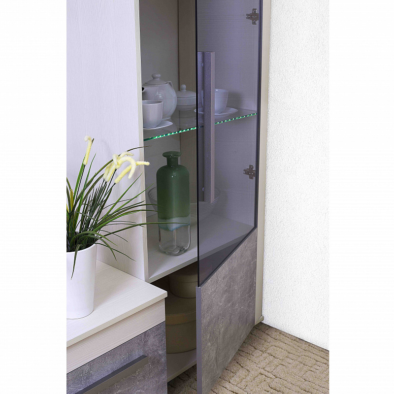 Посудный шкаф со стеклянной дверцей позволит выставить в гостиной те коллекционные и памятные вещицы, которыми вы дорожите. Стеклополки в обработке еврокромкой выдерживают до 10 кг каждая. Их можно декоративно подсветить с помощью светодиодной подсветки (в комплекте не поставляется, приобретается отдельно). Фасад перенавешивается на левую и правую сторону. Серебристая стильная ручка из массива дерева и серое тонирование стекло фасада вносят смелые дизайнерские штрихи в восприятии актуального декора "под бетон".