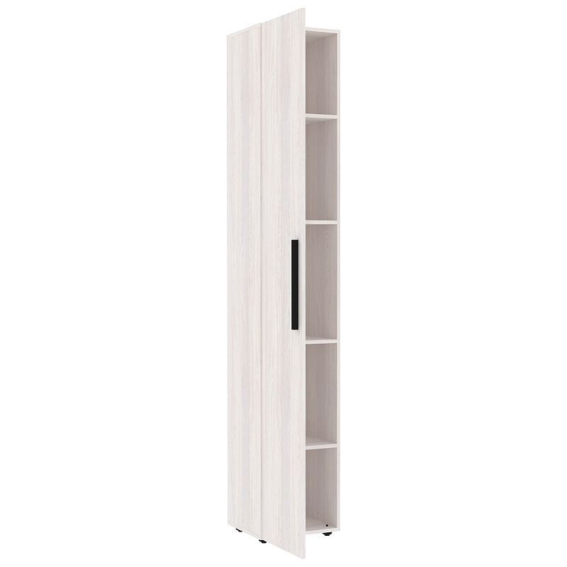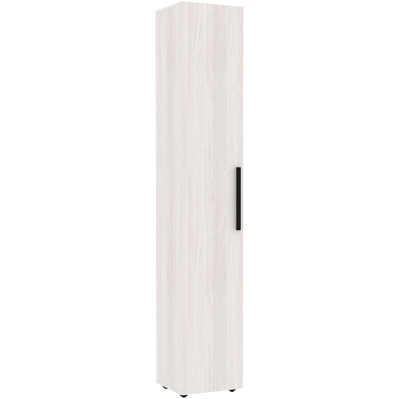 Шкаф для белья поможет подростку рассортировать и держать в порядке свои вещи. Узкий и высокий шкаф-пенал с четырьмя полками, регулируемыми по высоте. Глухой фасад в декоре Ясень Анкор светлый с ручкой из массива цвета серый металлик. Шкаф собирается как на левую, так и на правую сторону. Для надежности рекомендуем крепить шкаф к стене на подвесы.