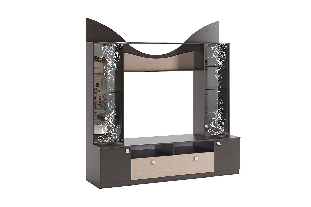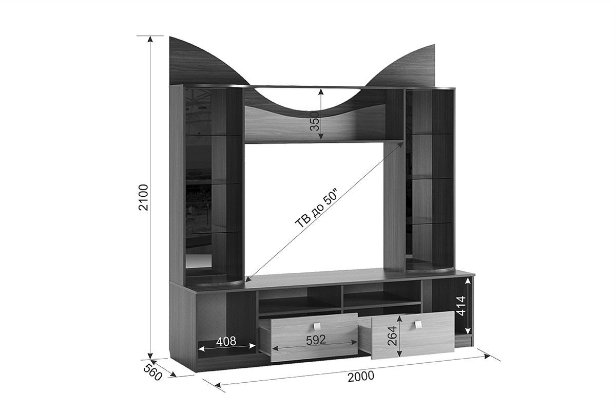 Состоит из: двух витрин под посуду, открытых полок для книг, места под ТВ, ниш для видеотехники, вместительных ящиков под вещи. Наполните интерьер Вашей гостиной легкостью и свободой вместе с мини-стенкой «Гармония». Стенка позволит Вам расположить в ней телевизор до 50 дюймов. Главной «изюминкой» «Гармонии» являются стеклянные витрины для посуды с зеркальными задними стенками, а изящный рисунок в сочетании со сверкающими стразами на них привнесет оригинальность, шик и утонченность. Рекомендуем комплектовать: с остальными модулями серии «Гармония».