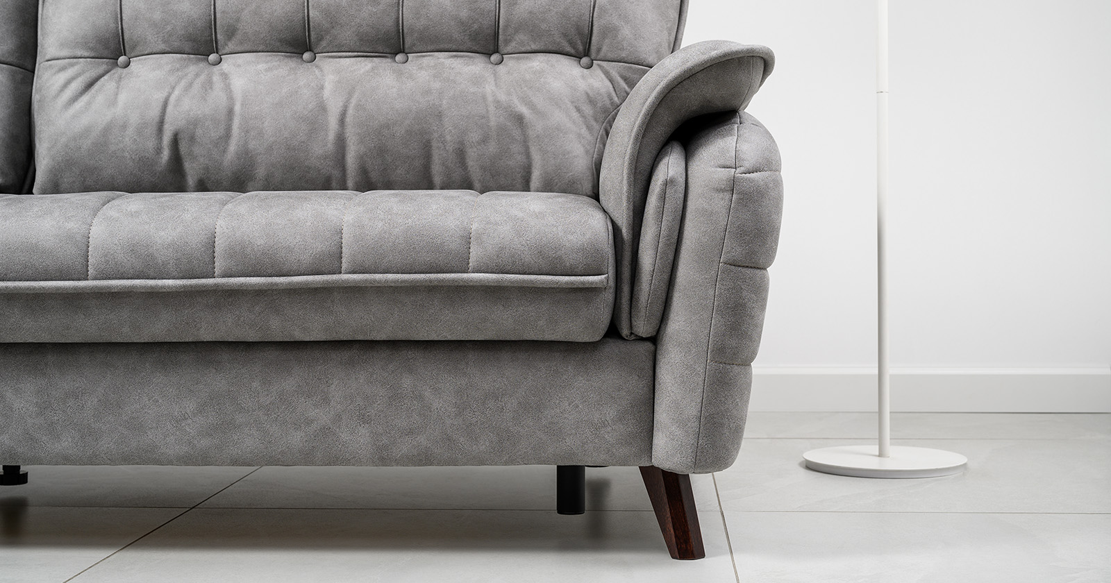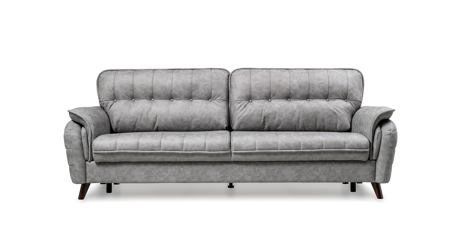 Декоративные канты на подушках дивана, подлокотниках и сиденье. Стежка на передней части сиденья и внешней части подлокотника. Защипы на верхней части подушки. Втяжки с пуговицами на приспинных подушках.