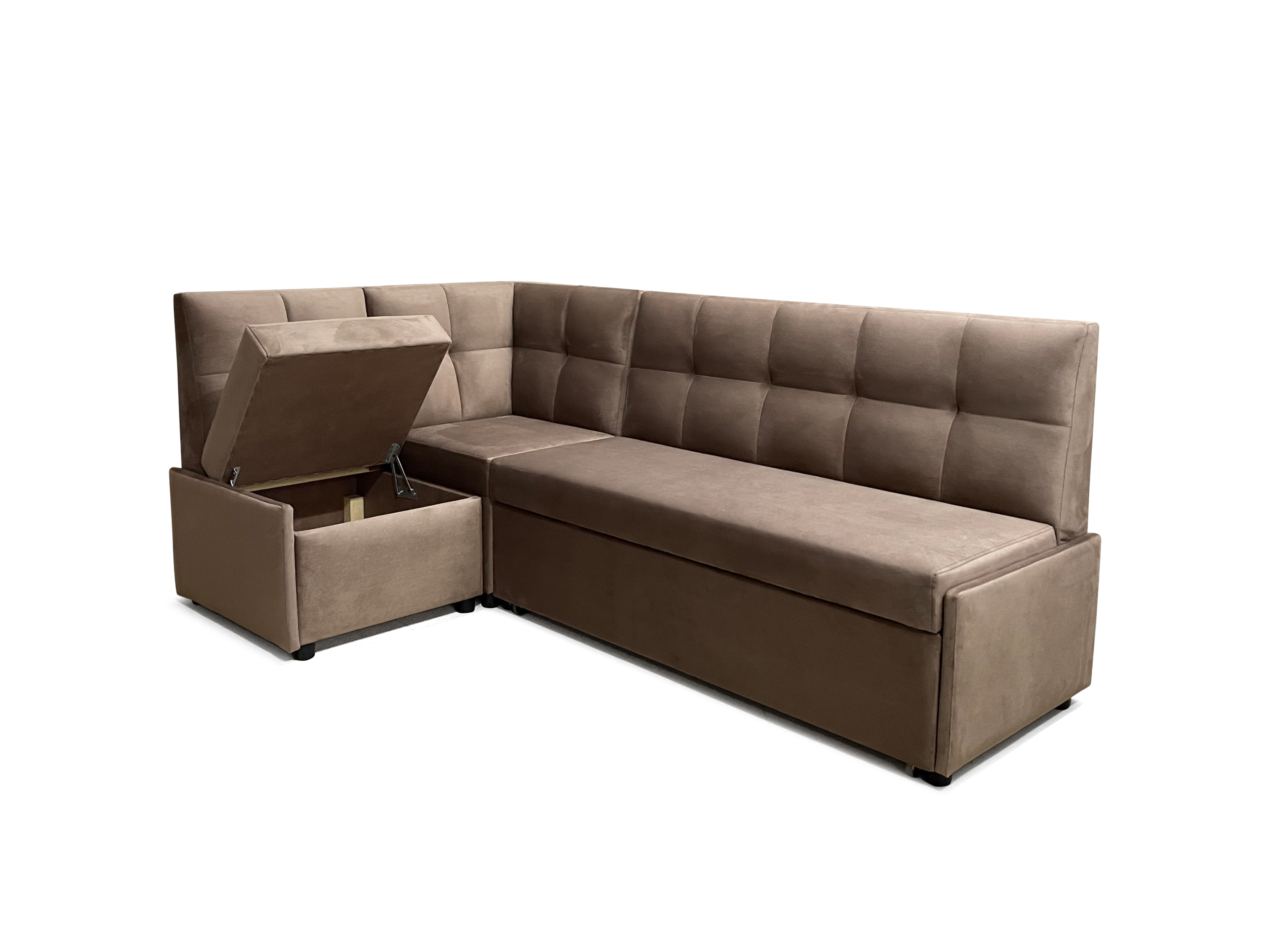 Описание: Модульная мебель предназначена для кухонных помещений. Стандартная комплектация является универсальной и может собираться в домашних условиях, на любую сторону, без применения инструментов. Ящик для хранения вещей. Раскладывается в спальное место, где обивка выполнена из основной ткани. Полка ЛДСП.